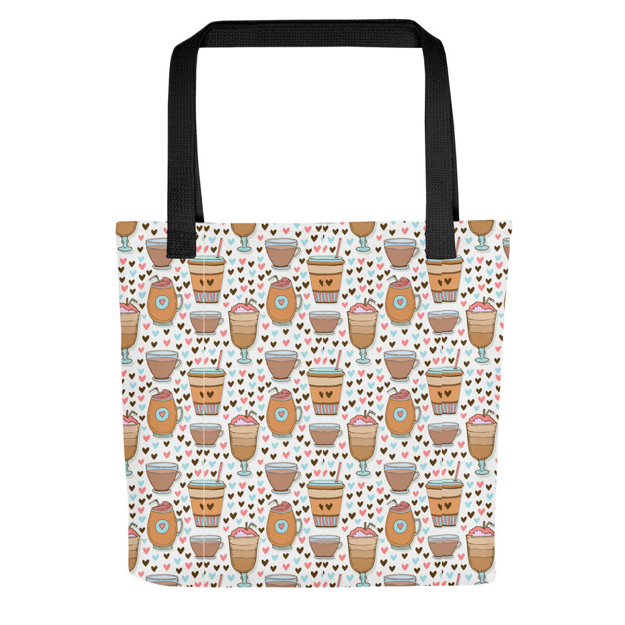 Add a pop of color to your daily routine with this Coffee for Dessert tote, featuring fun hearts and playful coffee concoction patterns on a crisp white background.