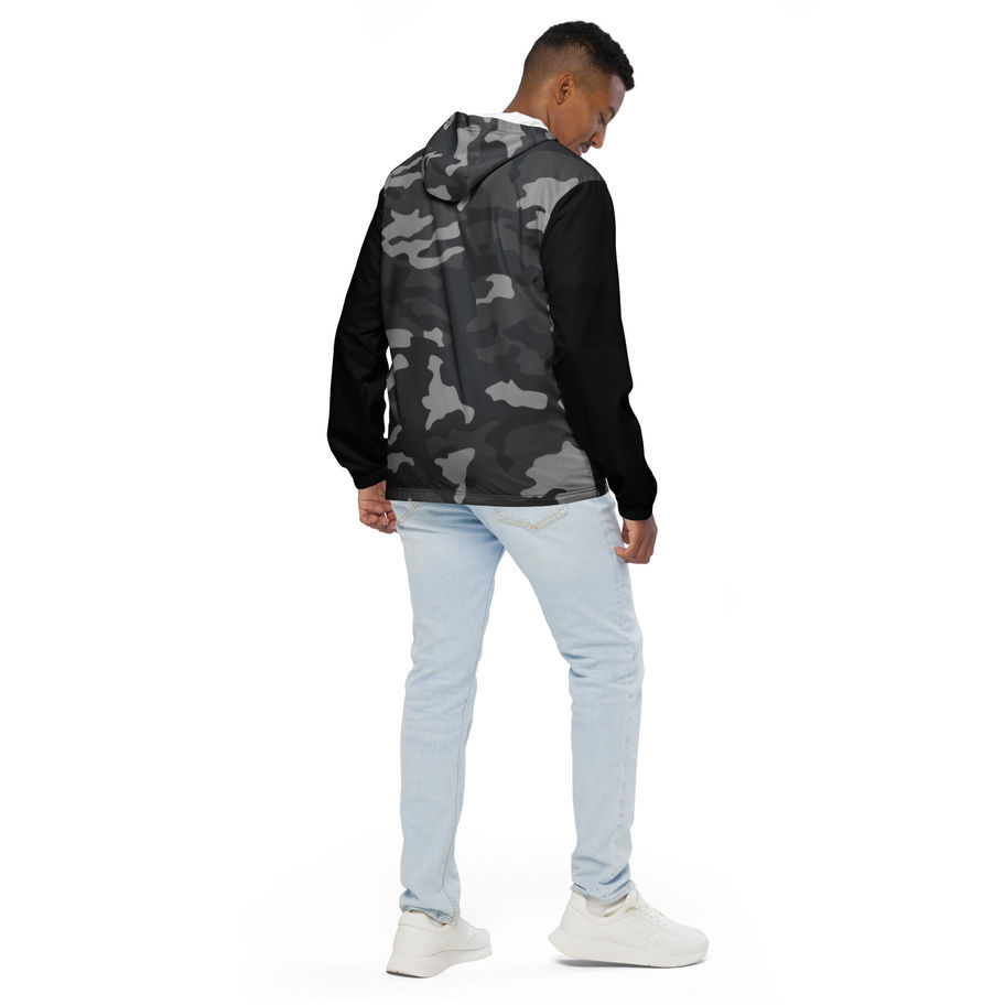 Take on the elements while rocking this fashion-forward Black and Gray Camo windbreaker. With a smooth camo design across the front, back, and hood and sleek, solid black sleeves, it delivers a laid-back vibe while keeping you protected.