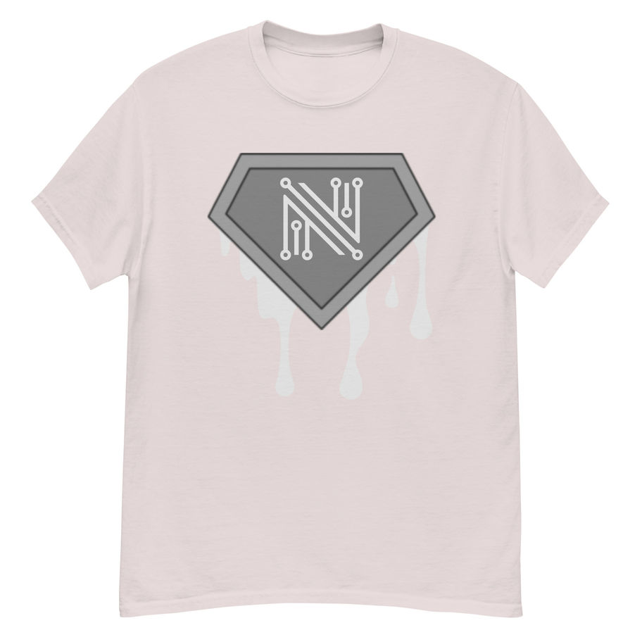 Suit up in sleek, silicon-charged swagger. This tee has a dripping chest emblem inspired by classic hero crests. With a bold circuit-style “N” etched in silver and gray at the center.