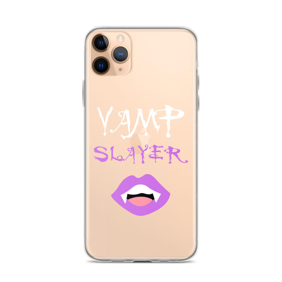 Show off your dark side with this chilling design: Vamp Slayer in a creepy-cool font, paired with a pretty purple-lipstick-coated fanged smile.