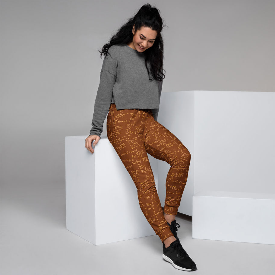 These brown joggers are covered in vibrant orange math equations, perfectly matching the Math Queen hoodie for a full, coordinated look.